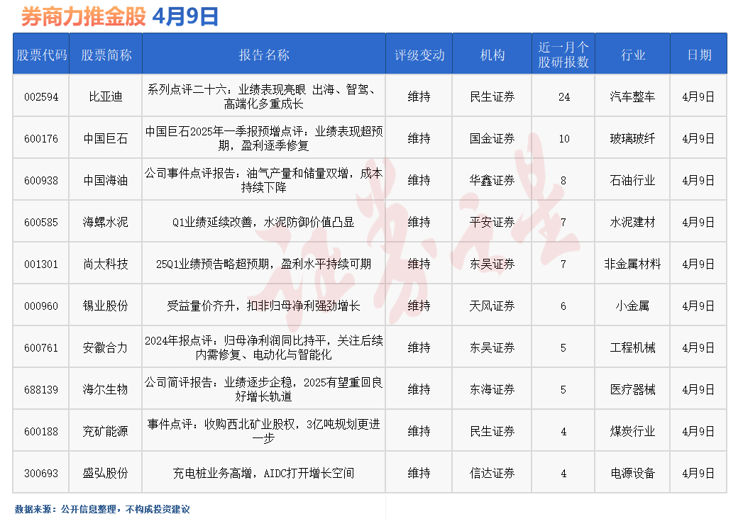 作为新能源车龙头企业,比亚迪最受券商关注,近一月获上海证券、中航证券、东吴证券、平安证券、国金证券、中原证券等24份券商研报关注,位居4月9日券商力推股榜首。4月8日,比亚迪发布25Q1业绩预告,25年一季度,公司预计实现净利润85-100亿元,同比增长86.04%-118.88%,超出市场此前的预期。