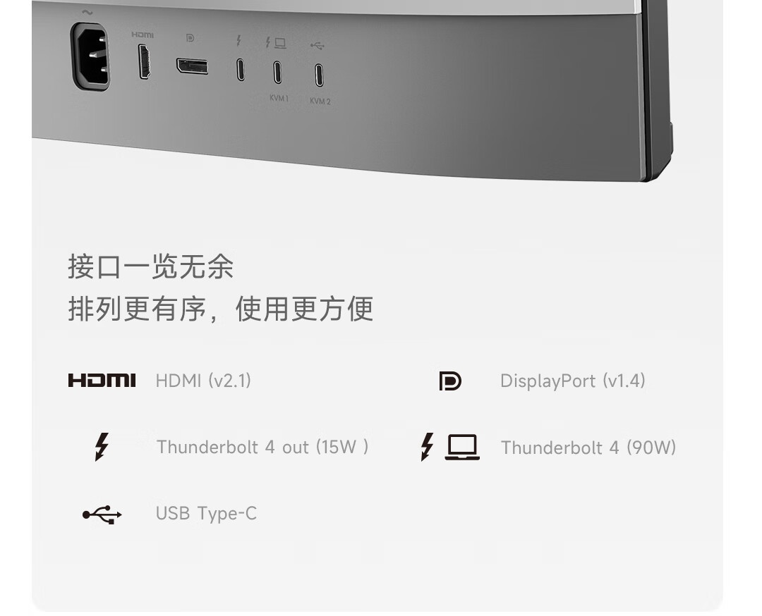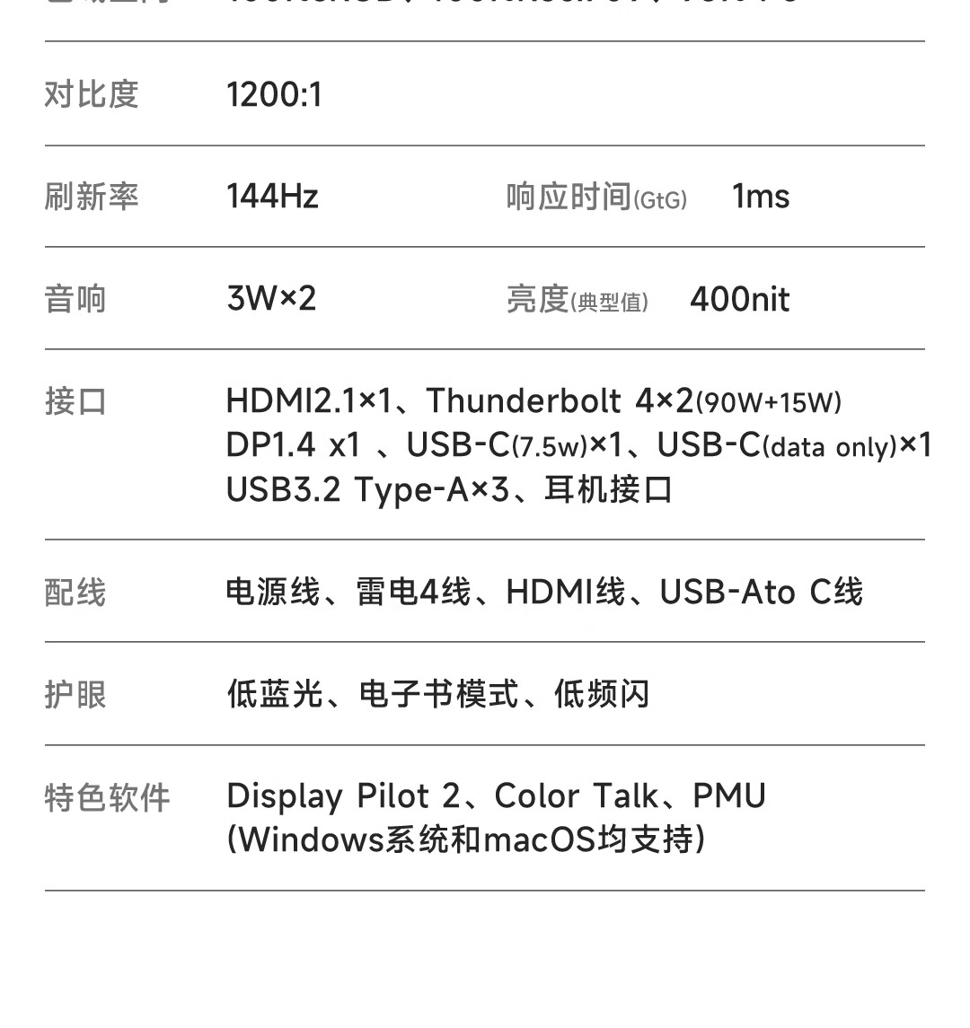 这款显示器采用银白色外观设计,配备DisplayPilot2显示器管家,支持声音/亮度/色彩一键调节;自带PMU校色仪;升级第三代无线小热盘控制器、双3W扬声器;提供雷电4上行(90W)、雷电4下行(15W)、HDMI2.1、DP1.4、USB-C*2、USB-A*3接口。IT之家附参数详情如下: