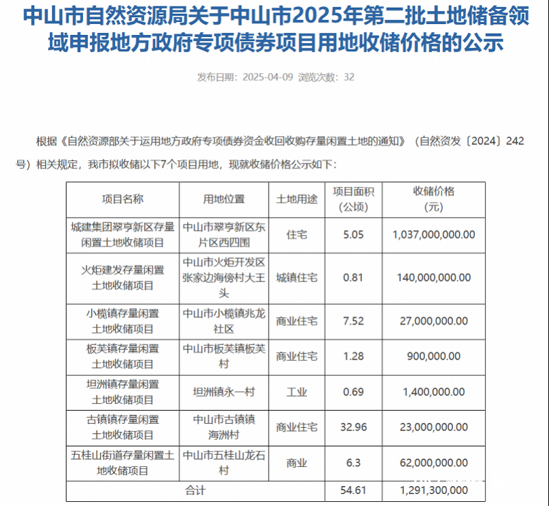 4月9日,中山市自然资源局发布了《关于中山市2025年第二批土地储备领域申报地方政府专项债券项目用地收储价格的公示》。