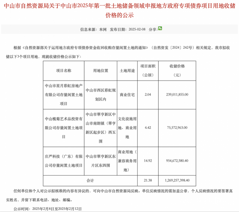 这是今年中山第二批拟收储土地。今年2月8日,中山市自然资源局发布了《关于中山市2025年第一批土地储备领域申报地方政府专项债券项目用地收储价格的公示》,公示显示,中山拟收储3个项目用地,分别为西区彩虹片区星月彩虹存量闲置土地、榄菊艺术品存量闲置土地及庄严科技闲置土地,面积共计超21公顷,收储价格近13亿元。