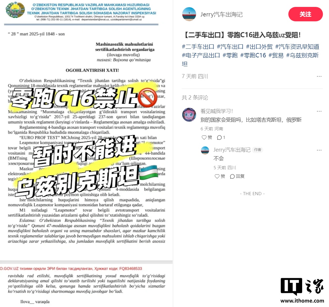 IT之家4月9日消息,近日网传一份来自乌兹别克斯坦的警告信,其中提到,乌兹别克斯坦海关的一次突击抽查中发现,零跑C16的电磁辐射强度超过联合国R10标准(主要针对车辆电磁兼容性)的16倍,严重违反《轮式车辆安全通用技术法规》附录3第44条的强制性规定。