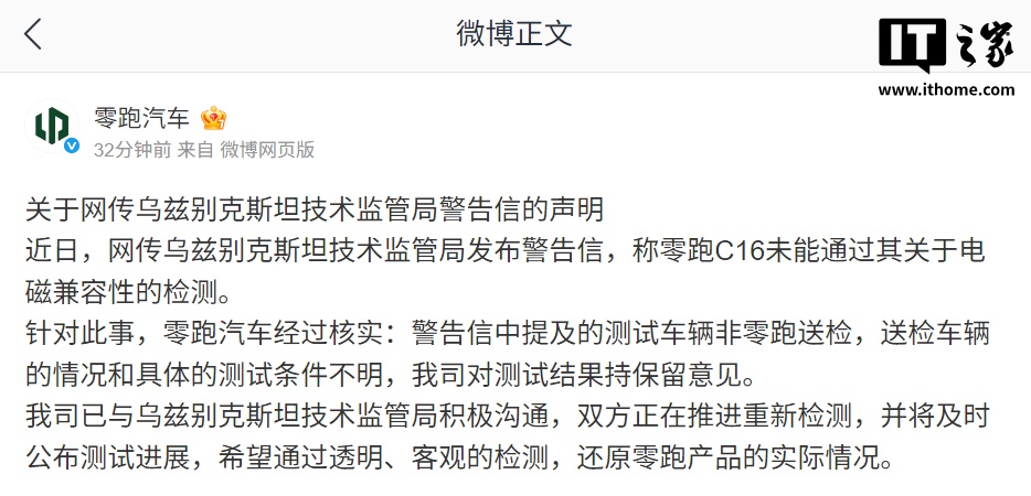 对此,零跑汽车官方今日晚间发布《关于网传乌兹别克斯坦技术监管局警告信的声明》,IT之家附全文如下: