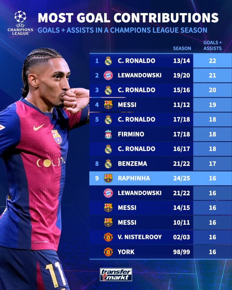 本赛季巴萨边锋拉菲尼亚在各项赛事中表现相当出色,其中欧冠中他在出场10次打进11球贡献5次,直接参与进球16个。拉菲尼亚能否打破由C罗保持的22个欧冠联赛单赛季直接参与进球纪录纪录?