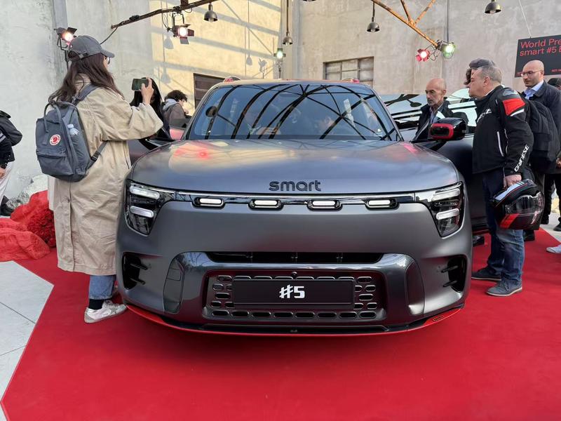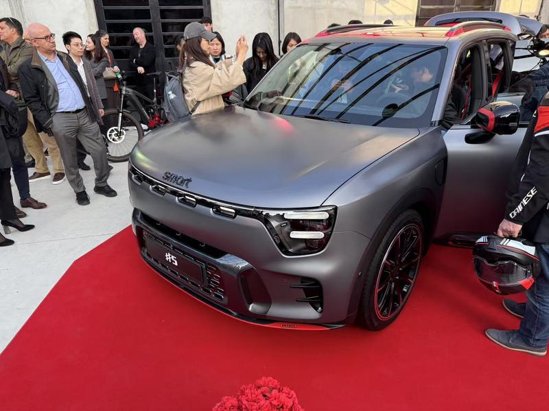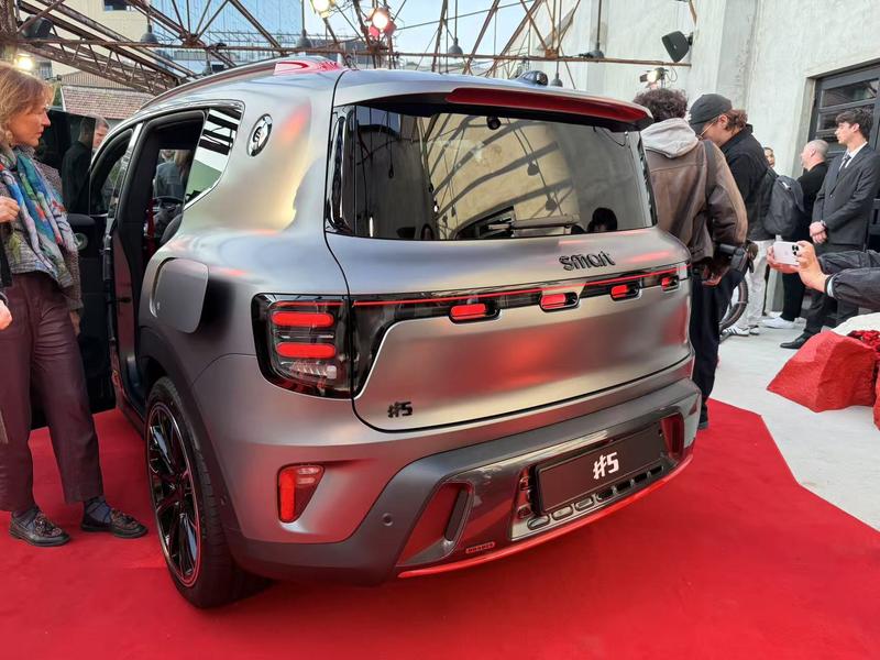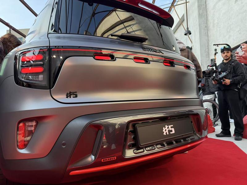 车身侧面,新车在后视镜壳、车顶等处加入红色装饰件,并配备20英寸宽五辐铝合金轮辋以及红色刹车卡钳。此外,smart精灵#5BRABUS超能版继续配备隐藏式门把手、D柱位置带有smart徽标。