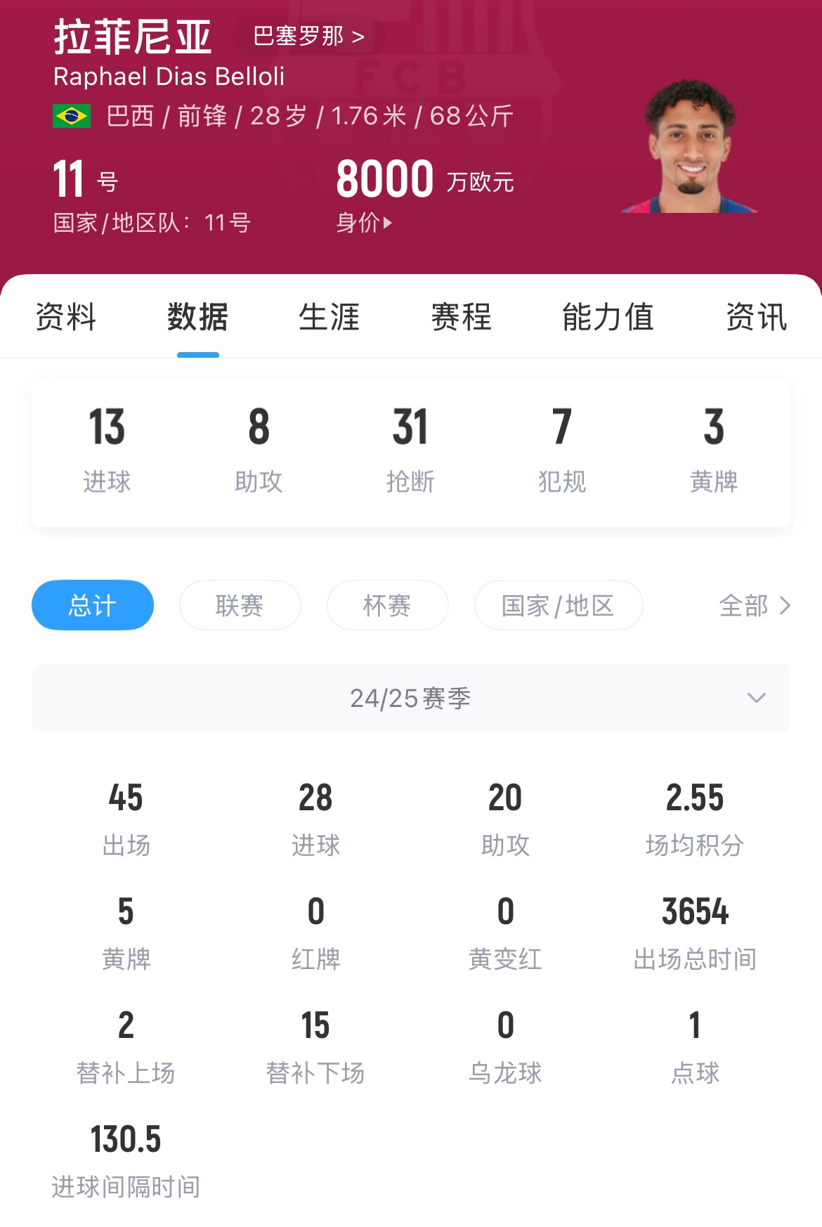拉菲尼亚目前以12球领跑欧冠射手榜,7个助攻领跑欧冠助攻榜,各赛事贡献28球20助。此外,目前的金球赔率中,拉菲尼亚也是最大热门。