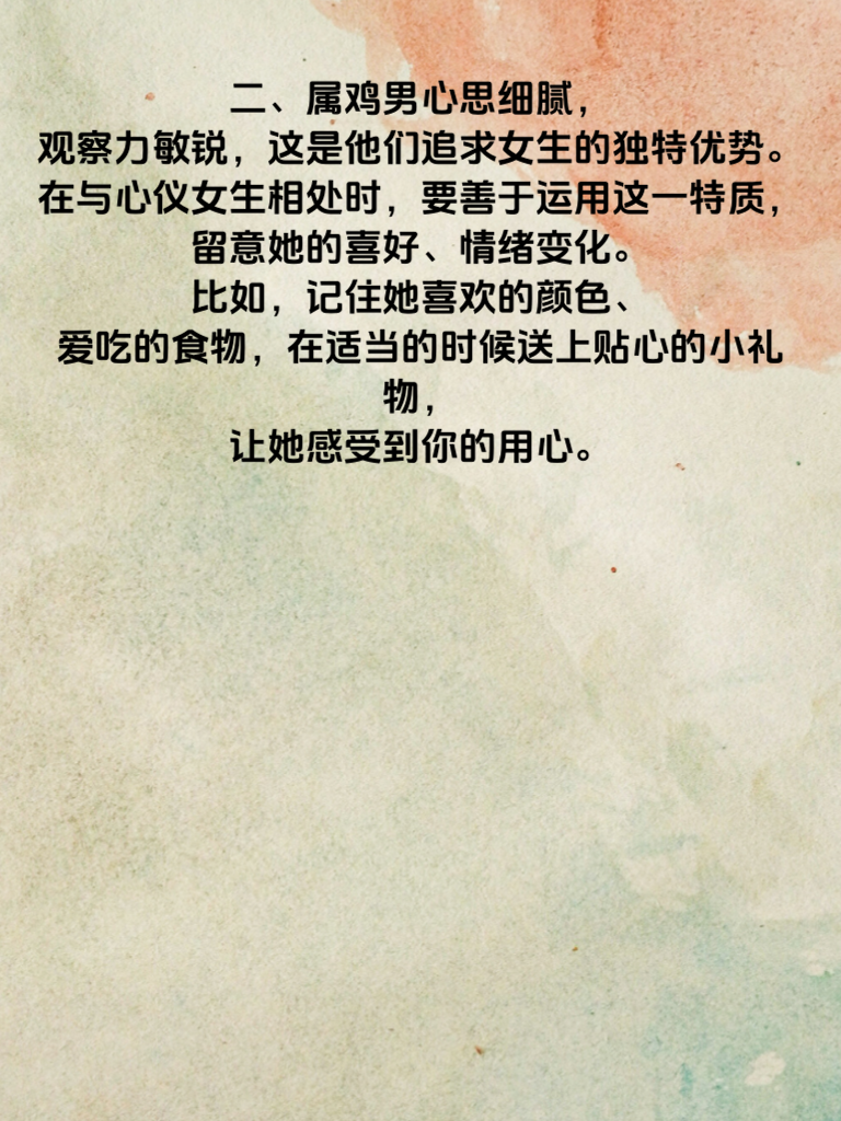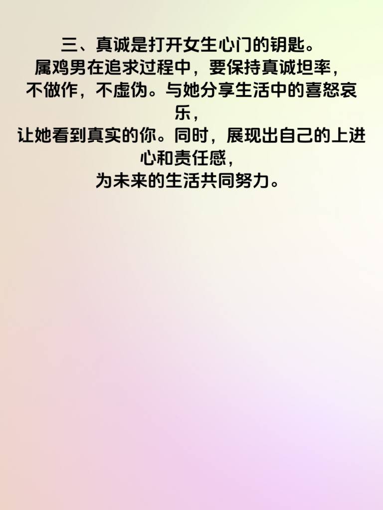 一、2025 年,对于属鸡男来说,是充满惊喜的一年。桃花与财星共璀璨,仿佛命运的画笔为他们勾勒出一幅绚丽多彩的情感画卷。在这一年里,属鸡男们有望邂逅那个让人心动的她。 二、属鸡男心思细腻,观察力敏锐,这是他们追求女生的独特优势。在与心仪女生相处时,要善于运用这一特质,留意她的喜好、情绪变化。比如,记住她喜欢的颜色、爱吃的食物,在适当的时候送上贴心的小礼物,让她感受到你的用心。 三、真诚是打开女生心门的钥匙。属鸡男在追求过程中,要保持真诚坦率,不做作,不虚伪。与她分享生活中的喜怒哀乐,让她看到真实的你。同时,展现出自己的上进心和责任感,为未来的生活共同努力。 四、在社交场合中,属鸡男要自信大方,展现出自己的魅力。主动与女生交流互动,不要害怕被拒绝。幽默风趣的谈吐能让气氛更加融洽,增加彼此的好感。抓住每一个相处的机会,让她逐渐走进你的世界,共同书写人生新篇。