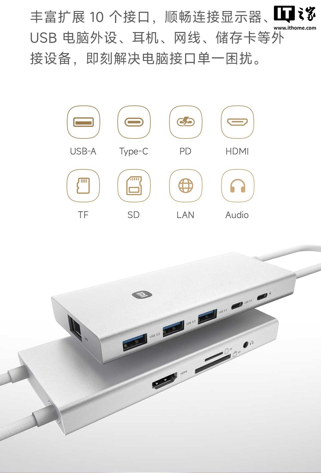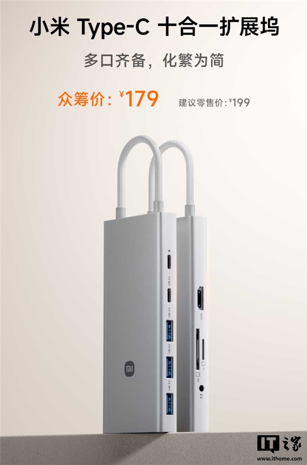 IT之家4月10日消息,小米推出了一款Type-C十合一扩展坞,该产品已上架小米商城和小米有品平台,将于4月16日上午10点正式开启众筹。这款扩展坞的建议零售价为199元,众筹价为179元。