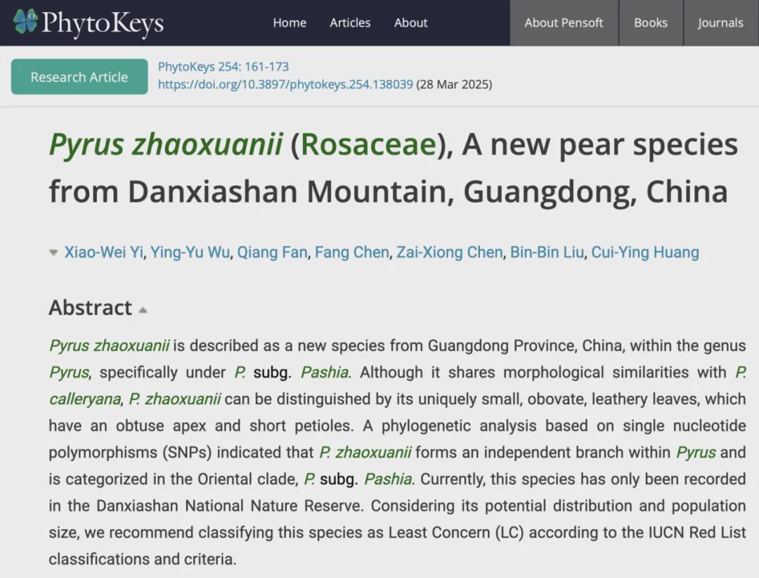 2025年3月28日,在丹霞山发现的苹果族(苹果亚科)梨属植物新种发表在国际植物分类学刊物《PhytoKeys》,这是由中山大学生命科学学院廖文波、凡强教授团队与中国科学院植物研究所刘彬彬副研究员团队合作发表的研究成果。