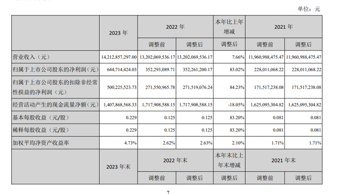 财报显示,2023年燕京啤酒营收约142.13亿元,同比增长7.66%;归属于上市公司股东的净利润约6.45亿元,同比增长83.02%。而2022年,燕京啤酒营收约132.02亿元,同比增长10.38%;归属于上市公司股东的净利润约3.52亿元,同比增长54.51%。