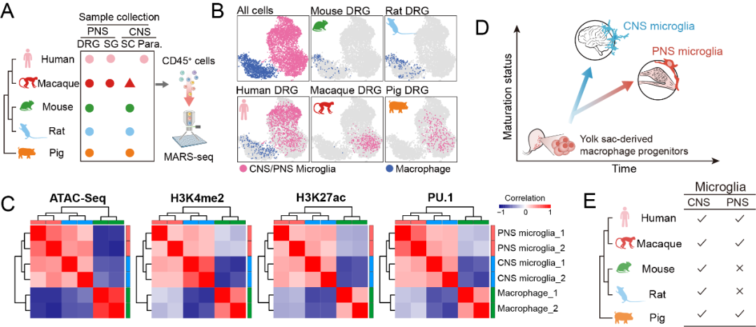 为验证上述“外周神经系统也存在小胶质细胞”的猜想,研究团队对人、食蟹猴、小鼠、大鼠和猪的中枢神经系统和外周神经系统(背根神经节、交感神经节)中的免疫细胞进行了无偏差单细胞转录组测序。跨物种整合分析显示,在人、食蟹猴和猪的外周神经节中存在一群与CNSmicroglia转录组相同的细胞类群,因此被命名为PNSmicroglia。