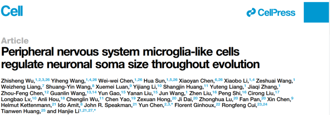 2025年4月7日,《Cell》期刊在线发表了李汉杰团队题为“Peripheralnervoussystemmicroglia-likecellsregulateneuronalsomasizethroughoutevolution”的论文,证实了上述猜想。该团队发现一群驻留在外周神经系统的巨噬细胞新类群,该类群与中枢神经系统小胶质细胞(CNSmicroglia)具有相同的转录组、表观组,蛋白表达,发育起源以及功能。