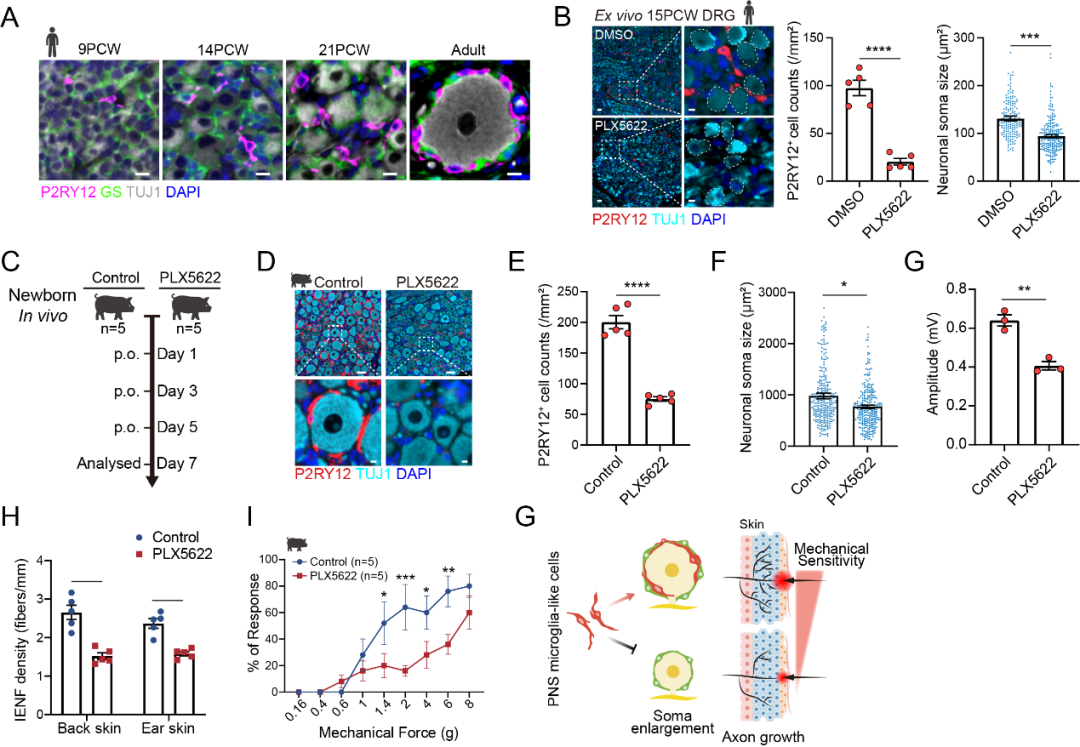 为了探究PNSmicroglia的生理功能,研究人员利用人和猪的胚胎样本对神经元-小胶质细胞-卫星胶质细胞三元结构的形成过程进行了深入研究。