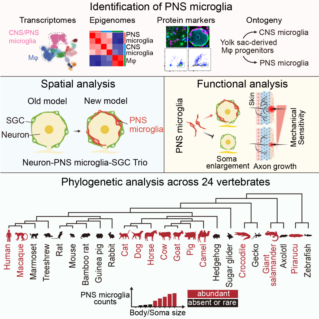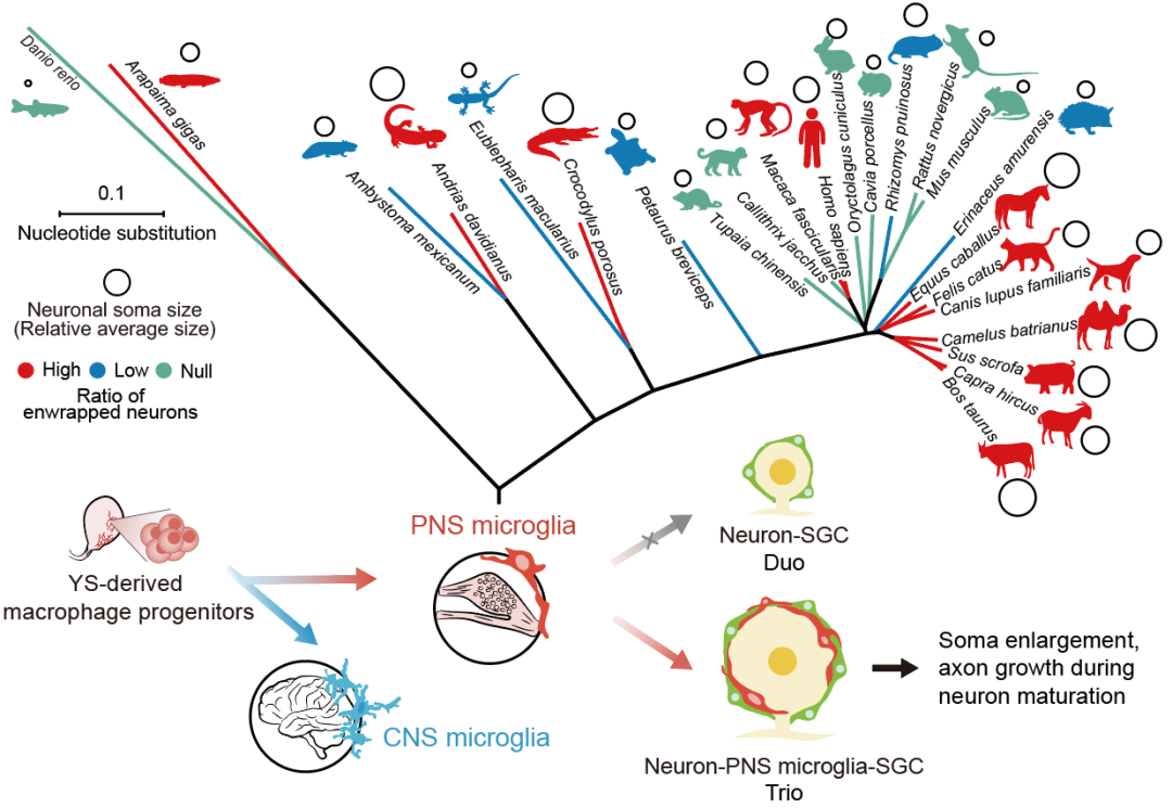 因此,他们将这一新发现的细胞类群,称为外周神经系统小胶质细胞(PNSmicroglia)。团队进一步发现PNSmicroglia直接包裹外周神经元胞体,可调节胞体增大和轴突生长,对外周神经元的成熟和功能至关重要。对24种脊椎动物进行的演化分析发现,PNSmicroglia在进化上非常古老,至少在硬骨鱼类的共同祖先已经存在。