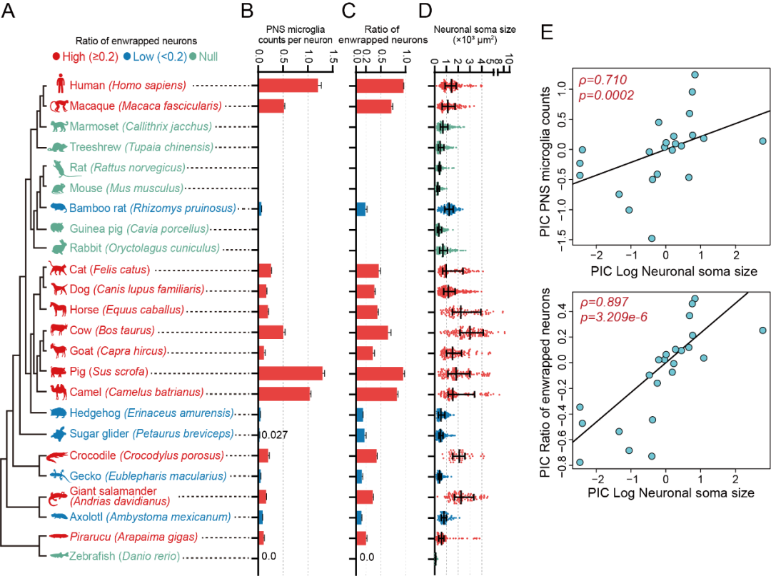 进一步的系统演化分析显示,PNSmicroglia的数量与物种体型大小以及外周神经元胞体大小在考虑系统发育相关性后仍存在十分显著的正相关,即体型越大的物种,其外周神经元胞体越大,并且存在较多的PNSmicroglia,而体型越小的物种,胞体越小,PNSmicroglia越罕见或不存在。上述演化模式,不仅验证了研究人员的推测,也从侧面证明了PNSmicroglia具有调控神经元胞体生长的功能。从进化选择角度来说,PNSmicroglia在大体型物种中经历了更大的选择压力从而被保留下来,导致其成为一类与脊椎动物体型大小相关的免疫细胞。