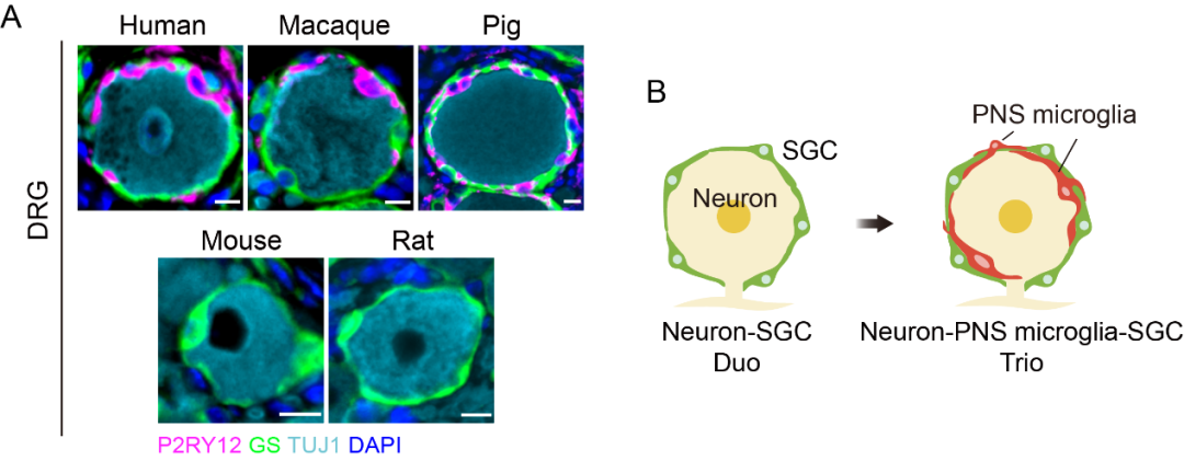 与CNSmicroglia不同的是,这群细胞仅在体型及外周神经元相对较大的脊椎动物中有保留,这也与它们支撑神经元胞体增大的功能一致。而在小体型物种(如小鼠、大鼠)中该群细胞变少或者消失。这一发现也合理地解释了为何在过去长达一百多年的时间里,这种在神经发育和免疫调节中都具有重要意义的细胞类型始终未被发现——生物学界长期依赖小鼠作为主要的模式生物。