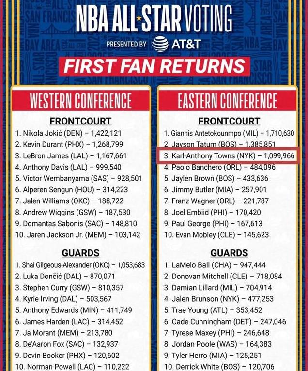 要知道,去年同期,唐斯首轮全明星一共只得到了139642张选票,今年直接夸张8倍,目前看,他很有可能成为全明星首发。