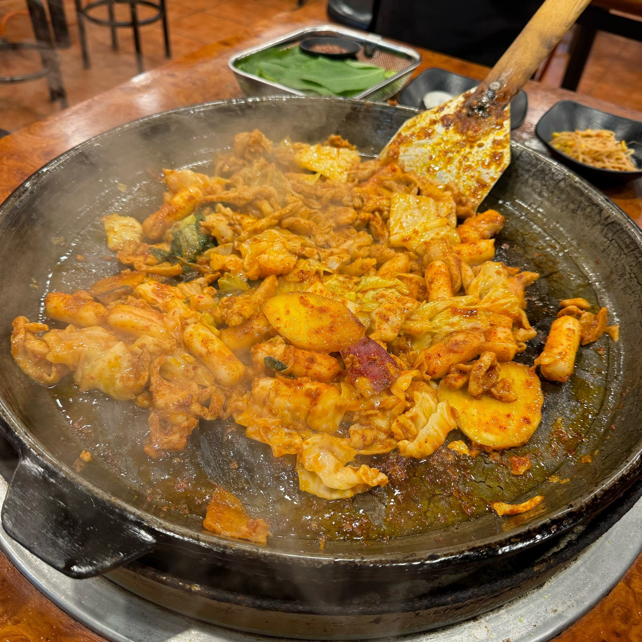 20年老牌韩料店,招牌脊骨锅用比脸还大的脊骨,炖至酥软脱骨,搭配辣白菜炒饭,锅巴焦香与酸辣交织,本地人按“锅”囤货。