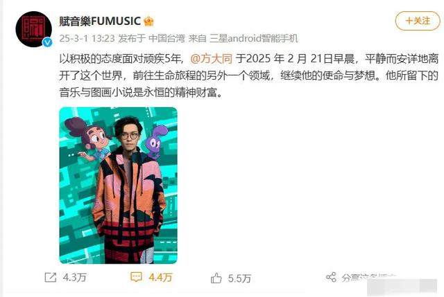 刚刚,据歌手方大同创立的音乐厂牌賦音樂FUMUSIC 发表通告:“以积极的态度面对顽疾5年, 方大同 于2025 年 2 月 21日早晨,平静而安详地离开了这个世界,前往生命旅程的另外一个领域,继续他的使命与梦想。”