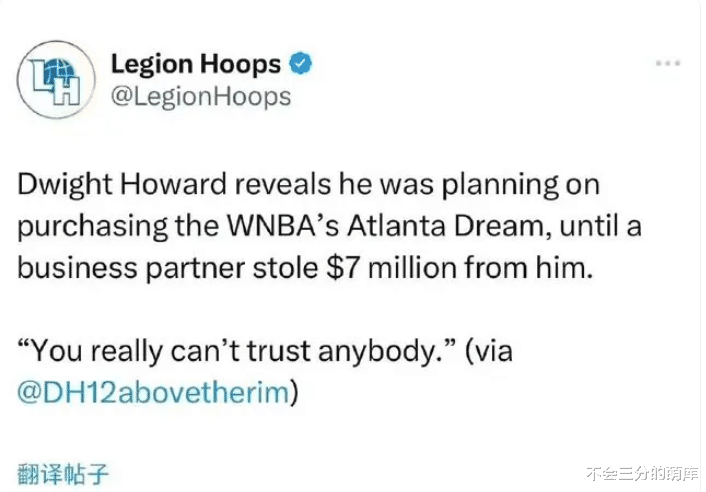 在本月,霍华德还透露表示自己被经纪人背刺,导致自己损失了700w美元,这让他原本想要收购WNBA球队的计划也因此破灭。不过霍华德虽然在节目中透露了这件事,但很多人依然不看好他的计划,毕竟WNAB也不是靠着700w美元就能收购的,尤其是在女篮蒸蒸日上的当下,霍华德想要入场无疑是痴人说梦。