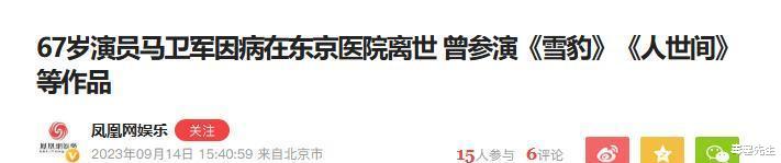 凤凰网娱乐讯,2023年9月14日,67岁演员马卫军因病在东京医院去世。他曾参演过《人世间》、《雪豹》等多部作品。