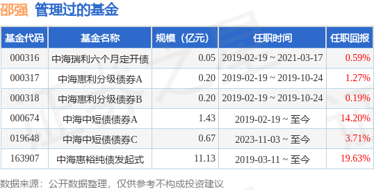 邵强先生:硕士学历,曾任中植企业集团北京管理总部助理分析员、兴业证券计划财务部研究员、招商银行上海分行同业经理、兴证证券资产管理有限公司债券研究员。2018年9月进入中海基金管理有限公司工作,现任基金经理。2019年2月至2021年6月任中海瑞利六个月定期开放债券型证券投资基金基金经理,2019年2月至今任中海中短债债券型证券投资基金基金经理,2019年3月至今任中海惠裕纯债债券型发起式证券投资基金(LOF)基金经理。