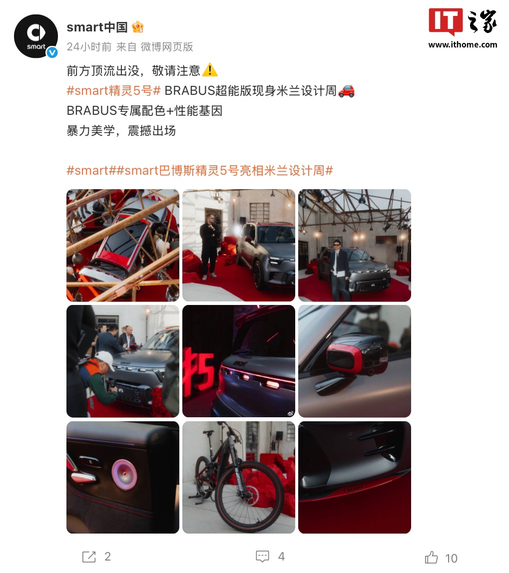 IT之家4月11日消息,smart宣布旗下smart精灵#5BRABUS超能版SUV车型正式在海外亮相,该车主打运动感设计,将在2025上海车展期间亮相国内。作为比较,当前在售的smart精灵#5官方指导价区间为23.99万-36.8万元。