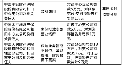 中国人民财产保险股份有限公司和田地区分公司、和田市支公司因保险业务管理不到位、套取费用、财务数据不真实被罚款共计48万元,相关责任人丁志红、唐亮被警告并罚款共计9万元。