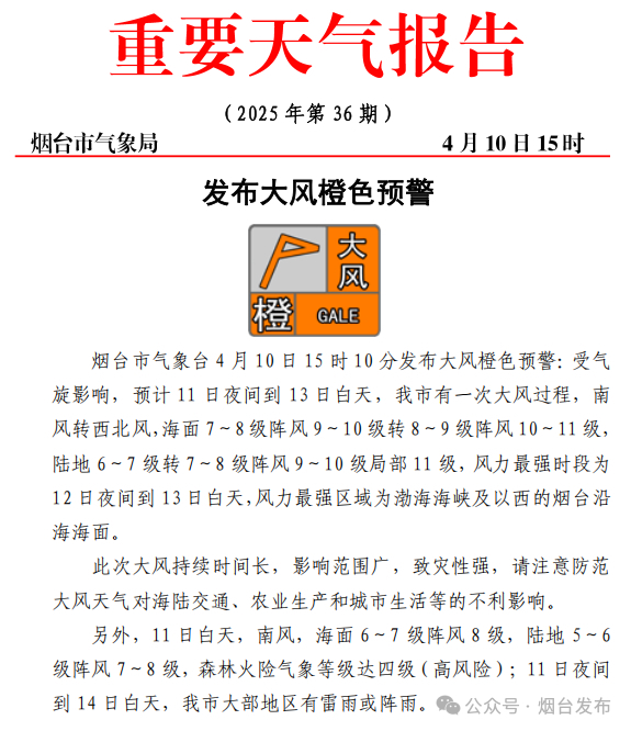 4月10日,烟台市气象台发布大风橙色预警:受气旋影响,预计11日夜间到13日白天,烟台市有一次大风过程,南风转西北风,海面7~8级阵风9~10级转8~9级阵风10~11级,陆地6~7级转7~8级阵风9~10级局部11级,风力最强时段为12日夜间到13日白天,风力最强区域为渤海海峡及以西的烟台沿海海面。