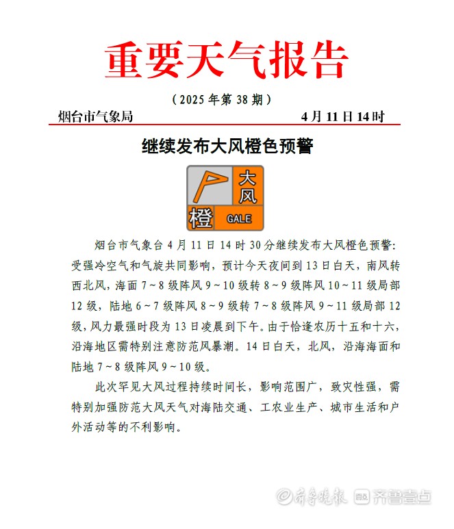 4月11日14时30分,烟台市气象台继续发布大风橙色预警:受强冷空气和气旋共同影响,预计11日夜间到13日白天,南风转西北风,海面7~8级阵风9~10级转8~9级阵风10~11级局部12级,陆地6~7级阵风8~9级转7~8级阵风9~11级局部12级,风力最强时段为13日凌晨到下午。由于恰逢农历十五和农历十六,沿海地区需特别注意防范风暴潮。14日白天,北风,沿海海面和陆地7~8级阵风9~10级。