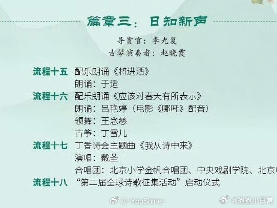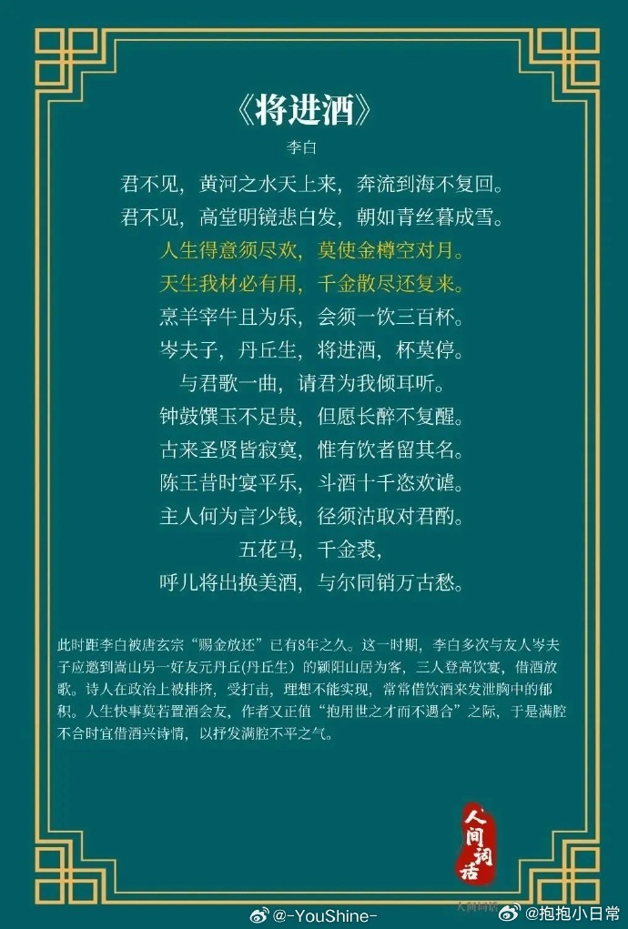 于适弹吉他朗诵将进酒 于适说要在诗会朗诵《将进酒》,脑海里已经浮现他气宇轩昂的样子了!李白的豪放配上他的诠释,感觉会碰撞出超震撼的火花!