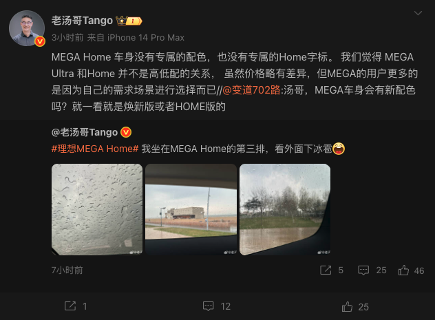 理想汽车产品线负责人汤靖在微博回应网友的提问时表示,MEGAHome家庭特别版车身没有专属的配色,也没有专属的Home字标。“我们觉得MEGAUltra和Home并不是高低配的关系,虽然价格略有差异,但MEGA的用户更多的是因为自己的需求场景进行选择而已。”汤靖表示。
