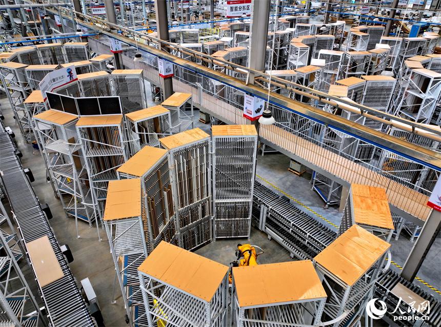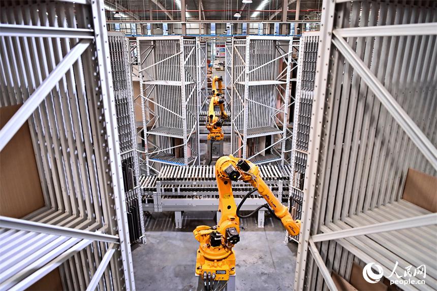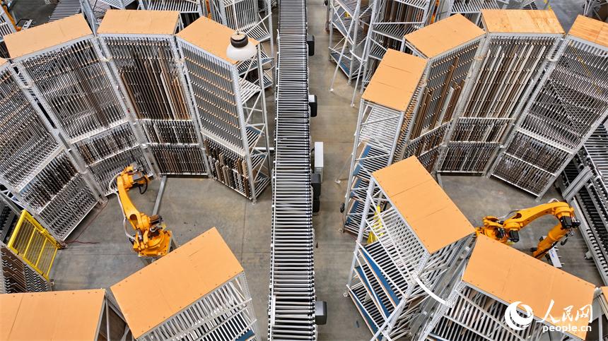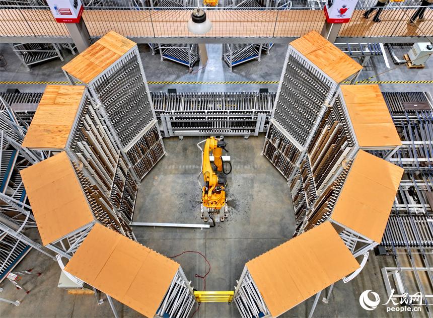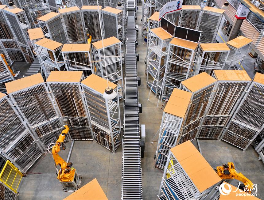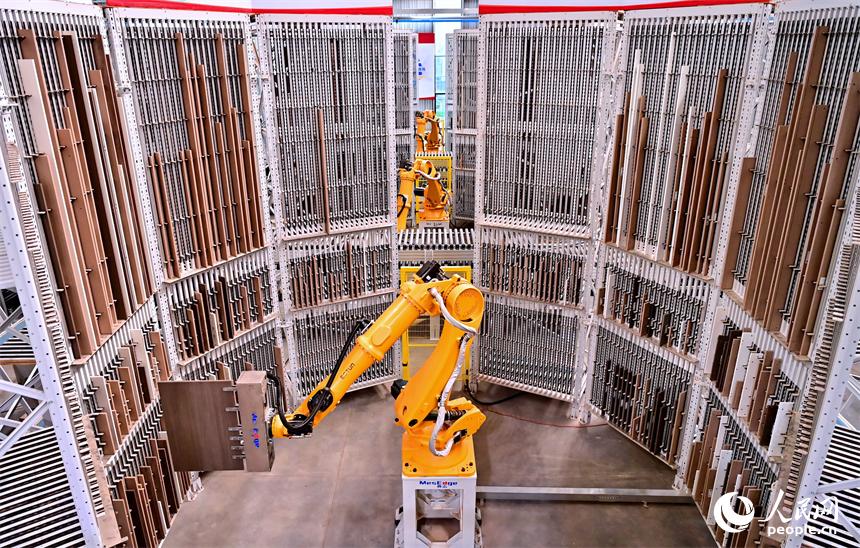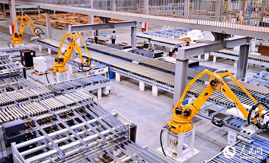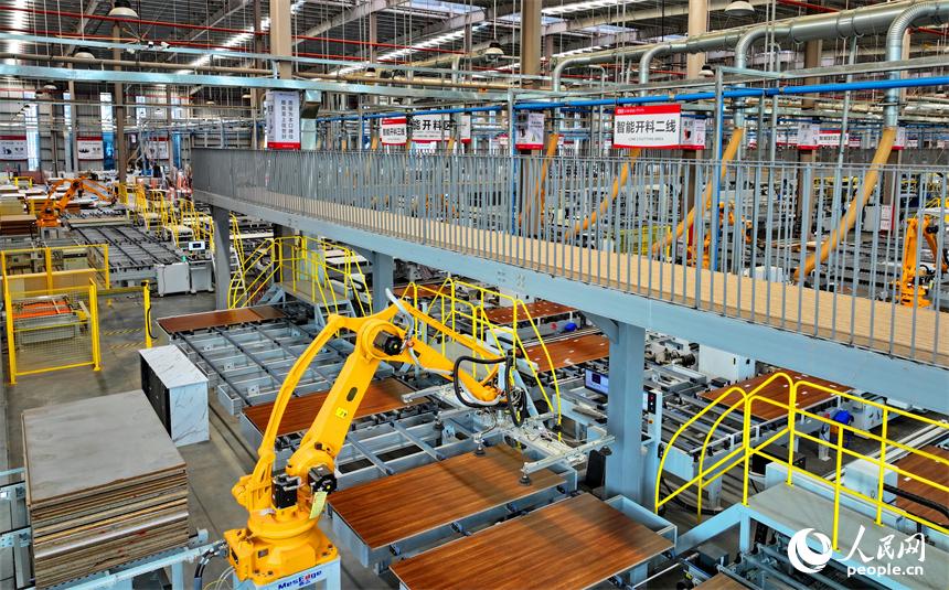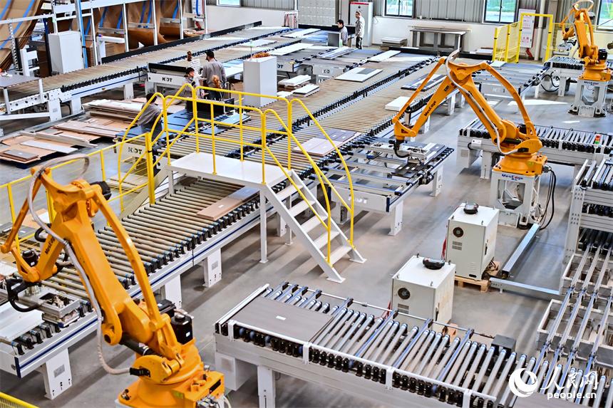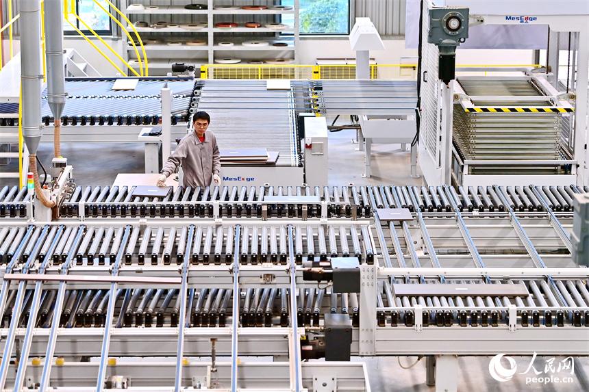 人民网赣州4月13日电(朱海鹏)近日,江西省赣州市南康区的一家定制家具制造企业,智能化生产线上机械臂飞速运转,工人忙着加工橱柜产品。