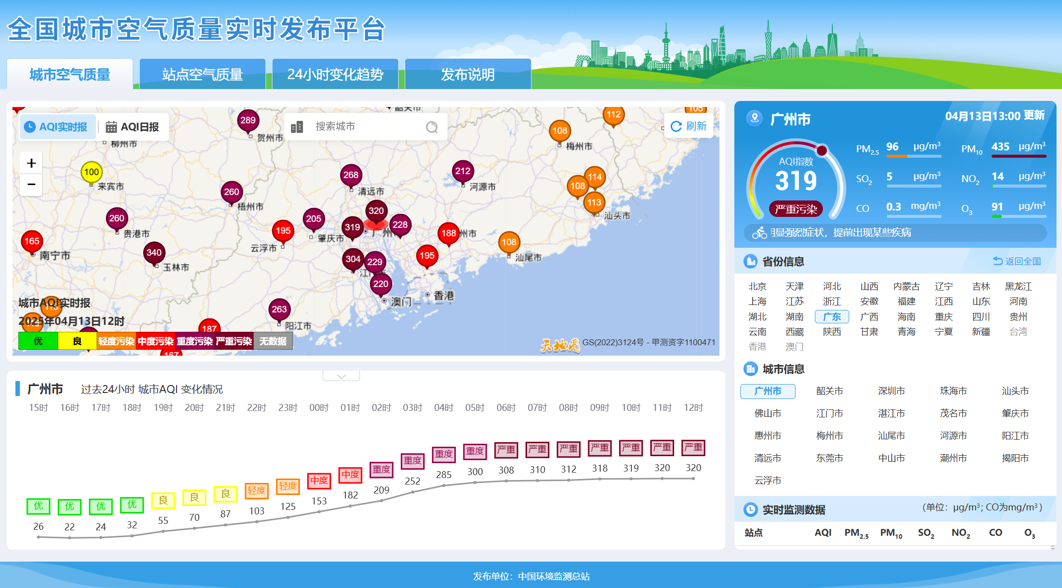 广州市生态环境局4月13日发布消息称,4月12日夜间起,广州受大范围沙尘天气影响,空气质量明显下降,超标污染物为PM10。预计今天内沙尘过程将持续影响广州,建议儿童、老年人和病人尽量留在室内,避免体力消耗,一般人群避免户外活动。