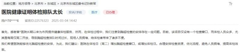 该网友建议,医院能优化胸部彩超检查的相关安排,在体检日(周二)增加检查窗口,或者增加体检日。此外,医院还应合理安排检查资源,优化流程,避免人员拥堵,提高体检效率。
