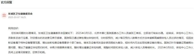 针对网友的建议,北京东城区卫健委回复表示,网友体检的医院根据情况已进行核实办理,虽然短时间内无法实现检查设备的增加,但将通过弹性增加体检时间、分时段预约、减少每日预约人数等方式和方法缓解高峰期体检人员过多的情况。