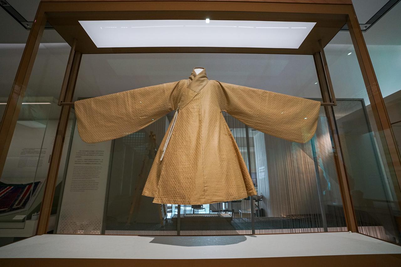 “2022年1月,南京云锦研究所承接了上海博物馆的摹制任务,整体项目周期耗时两年。”项目结果得到了上海博物馆及行业专家的验收和认可,从中可看出千百年前丝织文物的原本样貌,领略古人的工艺与审美。同期摹制的还有一件明代夹袍,也是由南京云锦研究所承接,陈列于展厅正入口处。