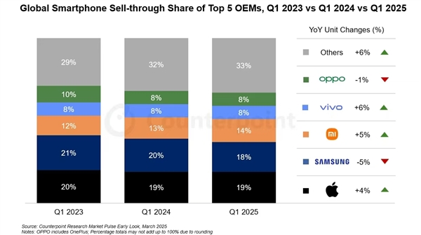 在Counterpoint公布的2025年Q1全球智能手机报告显示,vivo同比增长6%,排名上升至全球第四位,是全球前五大品牌中增速最快的厂商。