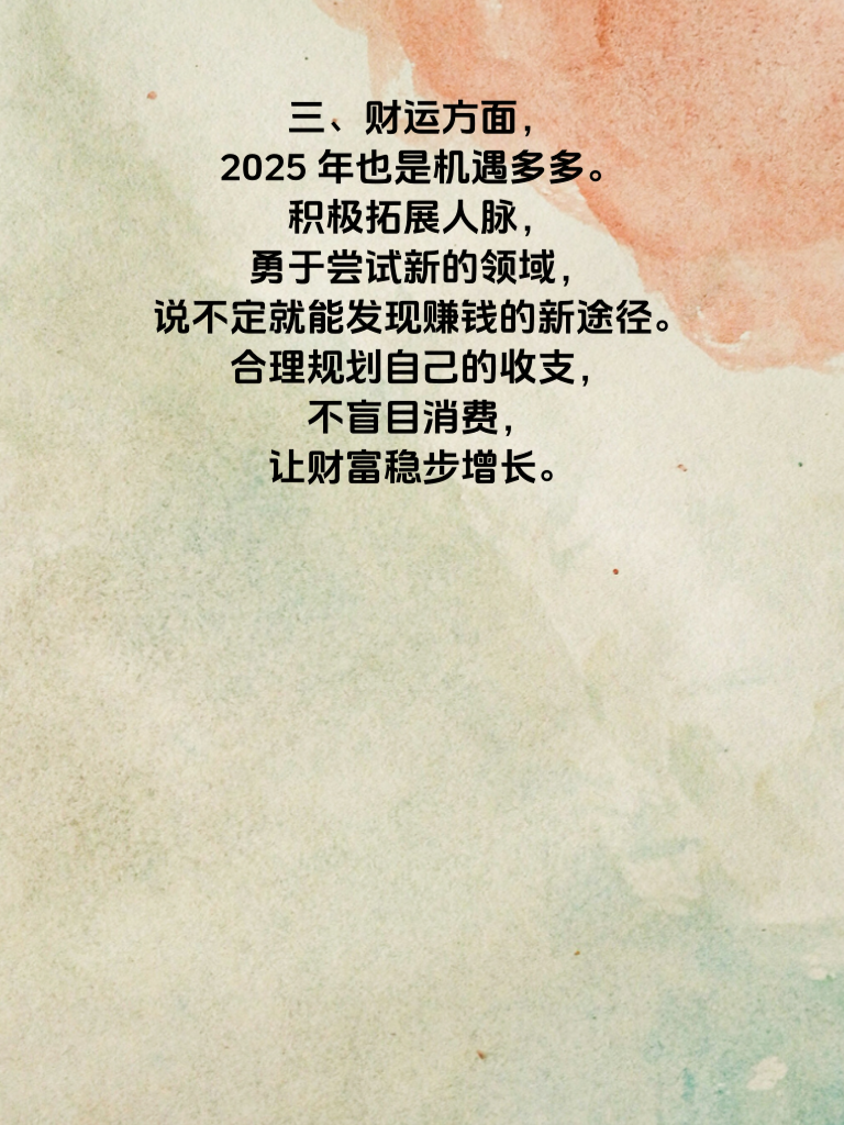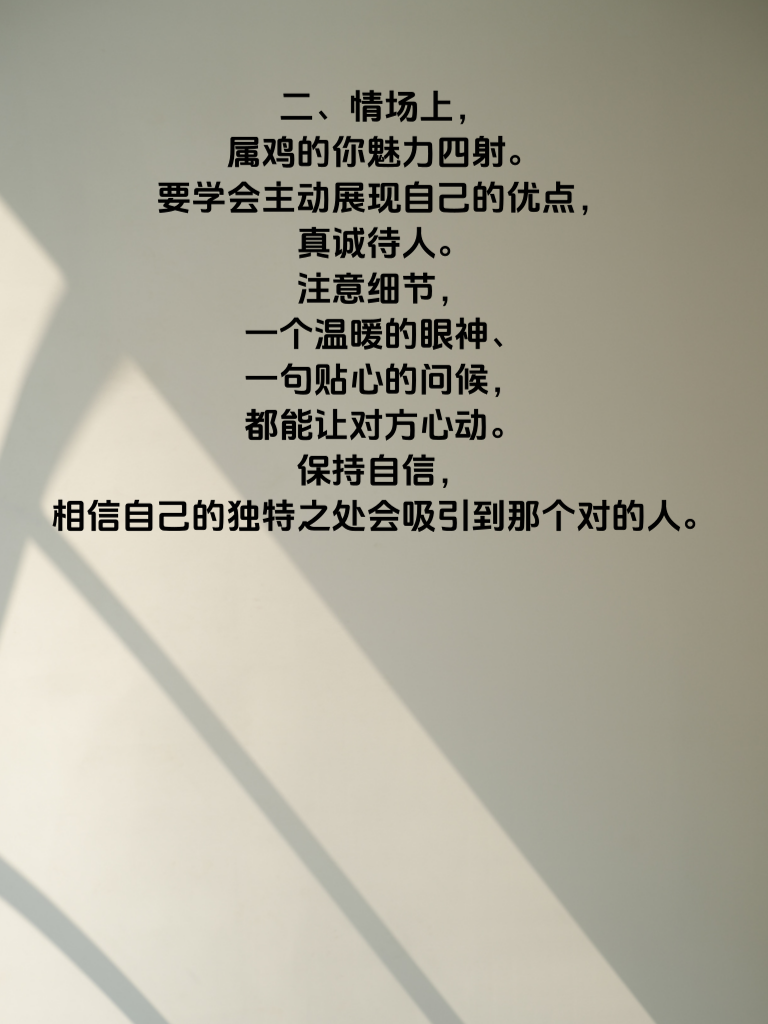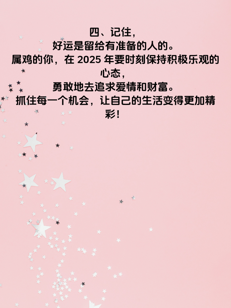 一、属鸡的朋友们,2025年可是你们的幸运年!在这一年里,情场和财运都将迎来大丰收,简直就是双赢家!快来接住这份满满的福气吧! 二、情场上,属鸡的你魅力四射。要学会主动展现自己的优点,真诚待人。注意细节,一个温暖的眼神、一句贴心的问候,都能让对方心动。保持自信,相信自己的独特之处会吸引到那个对的人。 三、财运方面,2025年也是机遇多多。积极拓展人脉,勇于尝试新的领域,说不定就能发现赚钱的新途径。合理规划自己的收支,不盲目消费,让财富稳步增长。 四、记住,好运是留给有准备的人的。属鸡的你,在2025年要时刻保持积极乐观的心态,勇敢地去追求爱情和财富。抓住每一个机会,让自己的生活变得更加精彩!