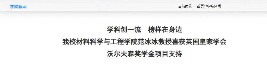 郑州大学材料科学与工程学院网站今年3月3日刊文《学科创一流榜样在身边——我校材料科学与工程学院范冰冰教授喜获英国皇家学会沃尔夫森奖学金项目支持》。