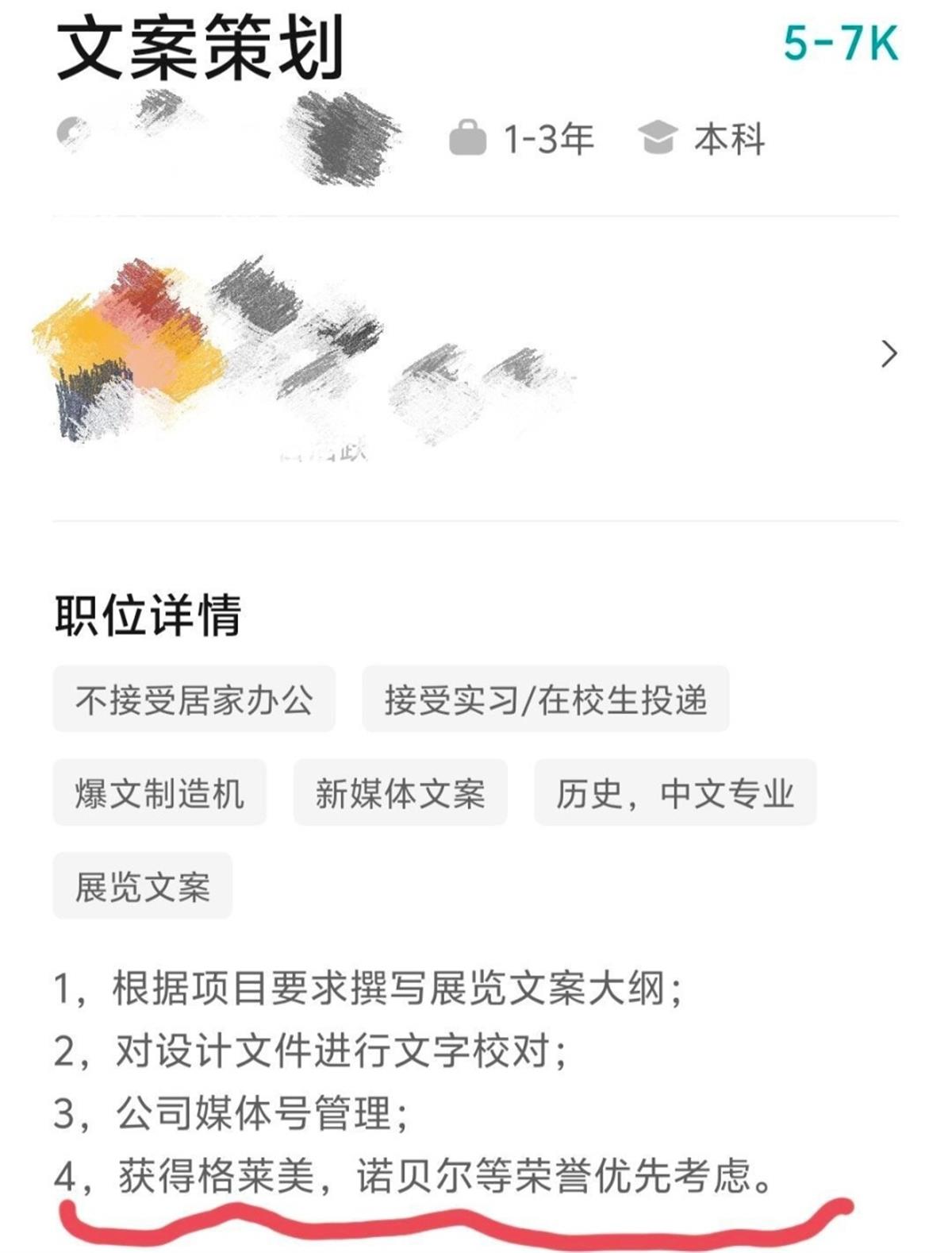 近日,有网友在某招聘平台发现,一家杭州的设计公司招聘文案策划,称获得格莱美、诺贝尔等荣誉的优先考虑,薪资为5-7k。4月14日,记者在社交平台上发现该职位已经关闭。