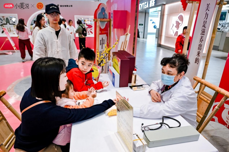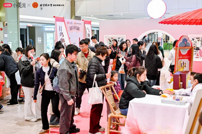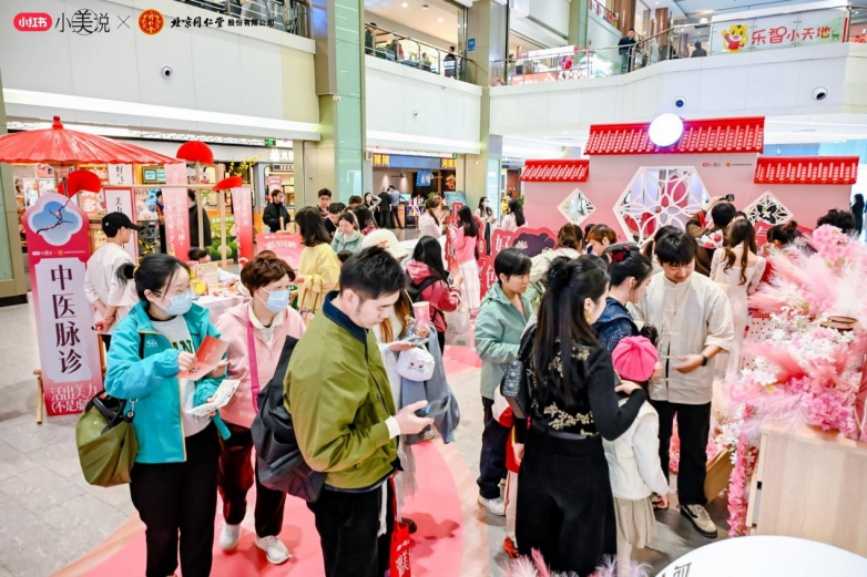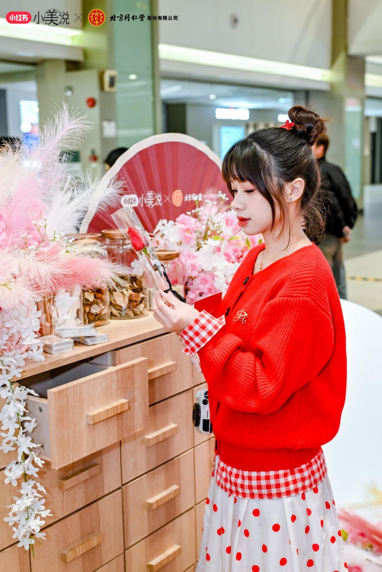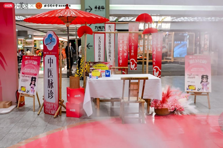 3月8日当天,北京同仁堂与小红书「小美说」还共同推出了线下快闪活动。活动现场花树、卷轴、红扇、拱门、古风打卡墙等布置将女神节活动氛围拉满。活动参与者通过入口处领取“处方笺”集章卡,在国风NPC的指引下,前往各个区域完成推举向上、中药花柜、情景剧场、古法健身操、中医脉诊等打卡游戏体验,便可参与抽奖活动。当天活动线下人流量近14.7万,活动参与人数超550人。