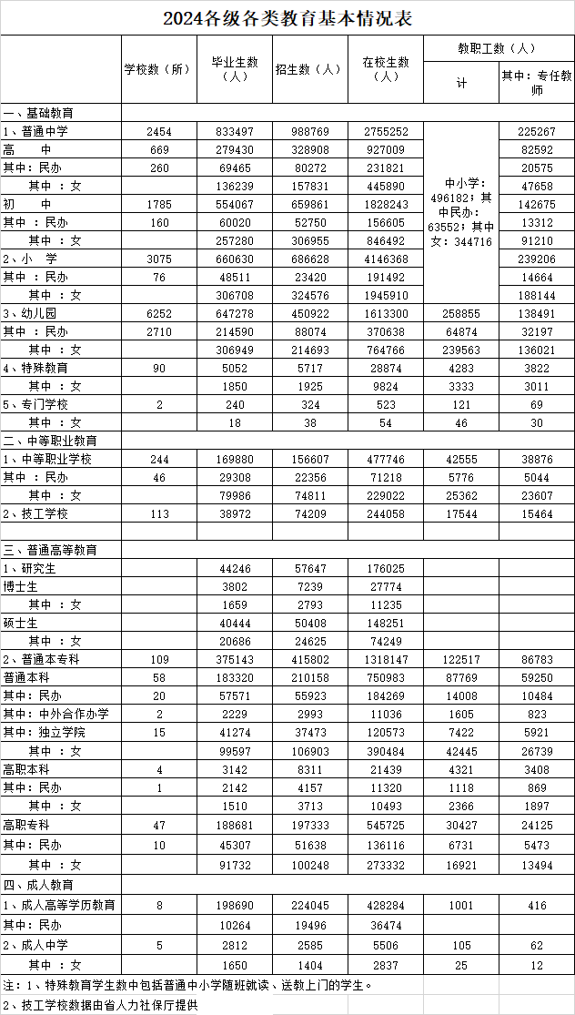普通高中。学校669所,比上年增加19所;招生32.89万人,比上年增加2.1万人,增长6.8%;在校生92.7万人,比上年增加3.94万人,增长4.4%;毕业生27.94万人,比上年增加0.15万人,增长0.5%。专任教师8.26万人,比上年增加0.27万人,生师比11.2:1。专任教师学历合格率99.89%,比上年增长0.01个百分点。生均校舍建筑面积34.8平方米;生均教学仪器设备值9172.72元;生均图书63.7册。普通高中体育运动场(馆)面积达标校数比例为99.3%,体育器械配备达标校数比例、音乐器材配备达标校数比例、美术器材配备达标校数比例、理科实验仪器达标校数比例均为99.6%。有校医院(卫生室)校数664所,占全省高中学校数的比例为99.3%,有学校首席信息官校数639所,占全省高中学校数的比例为95.5%。