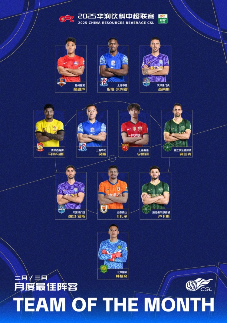 直播吧4月15日讯今天,中超联赛官方公布了2/3月最佳阵容,本次最佳阵容采用3-4-3阵型,吴曦、韩佳奇等球员入围。具体名单如下:
