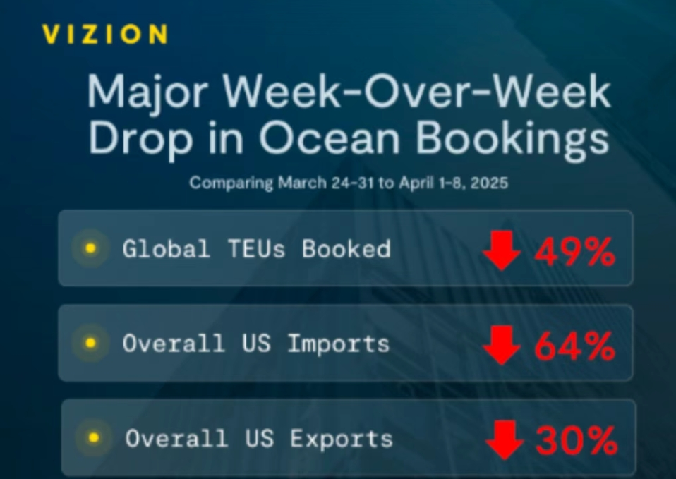 货运数据公司Vizion对比2025年3月24日~31日与随后一周(4月1日~8日)的数据,全部的预订标准箱数量环比大幅下跌49%,美国整体进口数量环比大幅下跌64%。