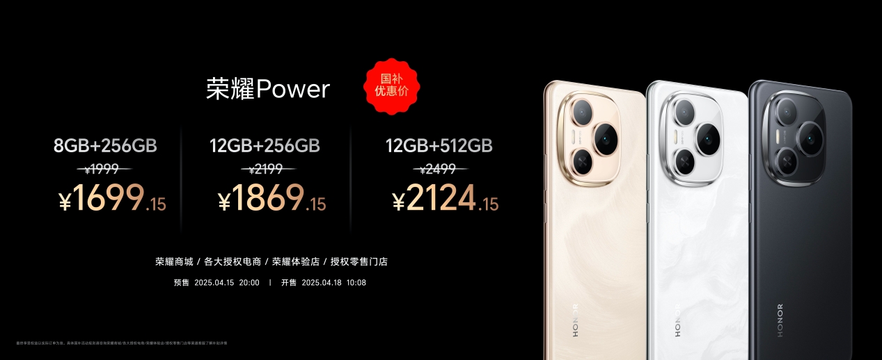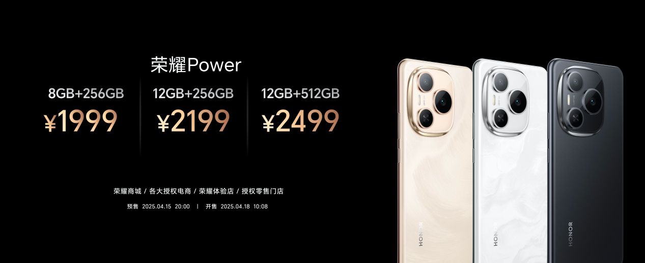 目前,荣耀Power已全面开启预售,并将于2025年4月18日10:08在荣耀商城、各大授权电商、荣耀体验店、授权零售门店正式开售。