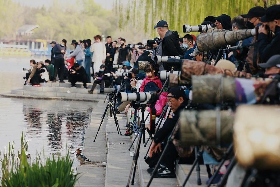 4月初,北京玉渊潭公园,大量市民游客观看“打鸟”景观。湖边聚集大量“长枪短炮”的摄影爱好者。