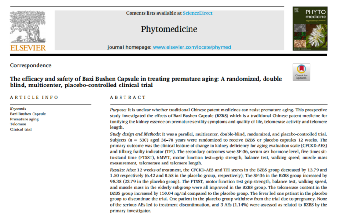 2024年6月,“八子补肾胶囊治疗早衰的随机、双盲、安慰剂对照、多中心临床研究”的论文在国际植物医学领域权威期刊《Phytomedicine》(影响因子7.9)上发表。