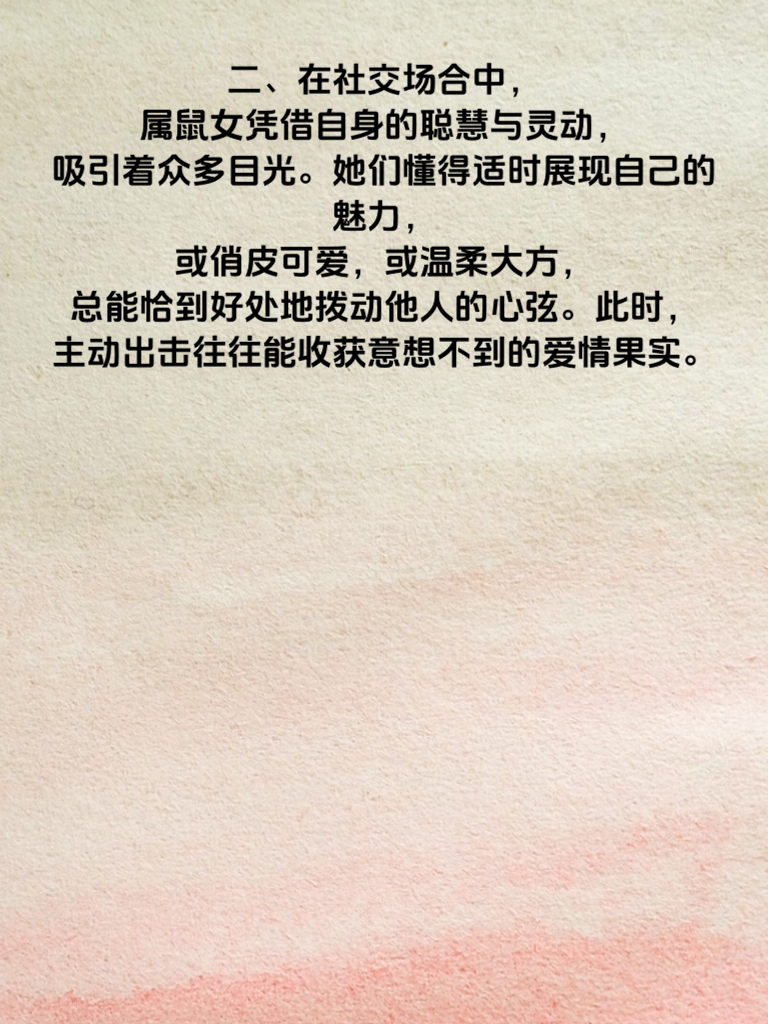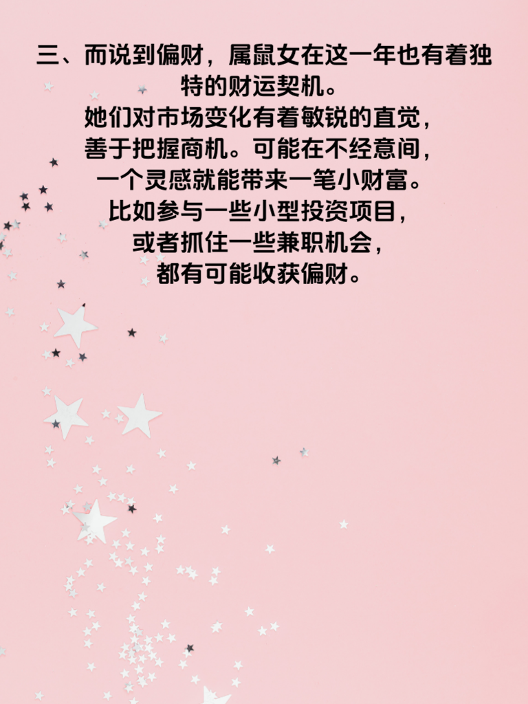 一、2025 年,对于属鼠女来说,情场宛如桃花绽放,偏财也似悄然撞满怀。在爱情的世界里,属鼠女会迎来诸多甜蜜机遇。她们心思细腻,善于洞察人心,这使得她们在与异性相处时,能敏锐捕捉对方的情感需求,从而轻松拉近彼此距离。 二、在社交场合中,属鼠女凭借自身的聪慧与灵动,吸引着众多目光。她们懂得适时展现自己的魅力,或俏皮可爱,或温柔大方,总能恰到好处地拨动他人的心弦。此时,主动出击往往能收获意想不到的爱情果实。 三、而说到偏财,属鼠女在这一年也有着独特的财运契机。她们对市场变化有着敏锐的直觉,善于把握商机。可能在不经意间,一个灵感就能带来一笔小财富。比如参与一些小型投资项目,或者抓住一些兼职机会,都有可能收获偏财。 四、但无论是情场还是财路,属鼠女都要保持清醒的头脑。在爱情中,不被一时的甜蜜冲昏,用心经营才能长久。在偏财面前,不盲目跟风,理性判断才能稳稳获利。如此,2025 年定能情财双收,绽放属于自己的精彩。