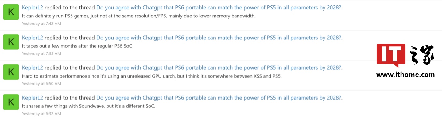 IT之家4月16日消息,消息人士KeplerL2曾于3月17日在NeoGAF论坛的讨论帖中宣称索尼的次世代PlayStation掌机将采用一颗15W功耗的3nm制程SoC。而在昨日(4月15日),KeplerL2又补充了更多信息: