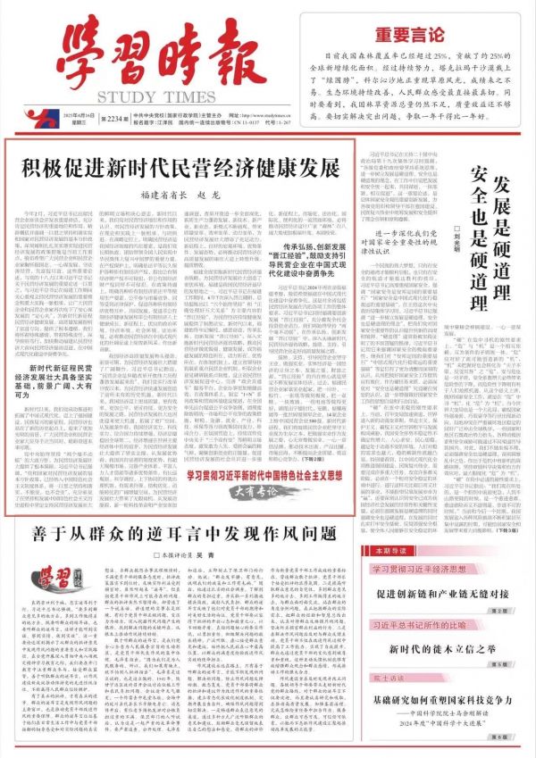 今年2月,习近平总书记出席民营企业座谈会并发表重要讲话,充分肯定民营经济的重要地位和作用,精辟概括并强调一以贯之坚持和落实党和国家对民营经济发展的基本方针政策,深刻阐明扎扎实实落实促进民营经济发展的政策措施是当前工作重点,殷切希望广大民营企业和民营企业家胸怀报国志、一心谋发展、守法善经营、先富促共富。这些重要论述,与党的十八大以来习近平总书记关于民营经济发展的重要论述一以贯之,与习近平总书记在福建工作期间关心重视支持民营经济发展的重要理念和重大实践一脉相承,让广大民营企业和民营企业家再次吃下了安心谋发展的“定心丸”,为新时代新征程民营经济健康发展、高质量发展指明了前进方向、提供了根本遵循。我们将怀着特殊感情、带着特殊责任,深学细悟笃行,加快推动福建从民营经济大省向民营经济强省迈进,在中国式现代化建设中奋勇争先。